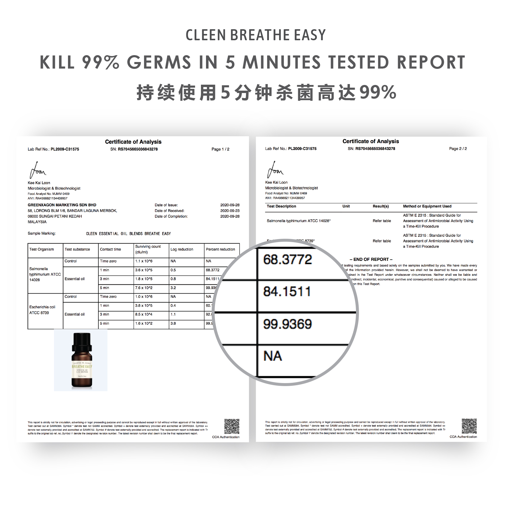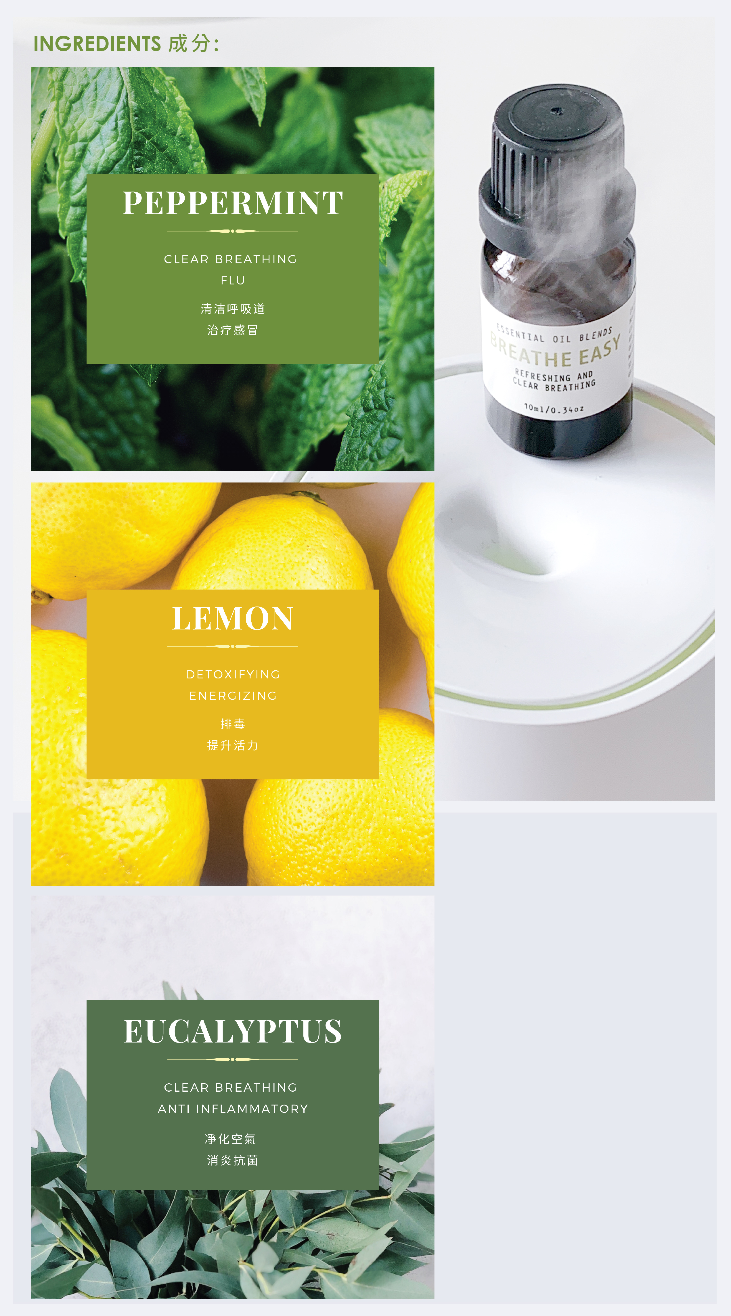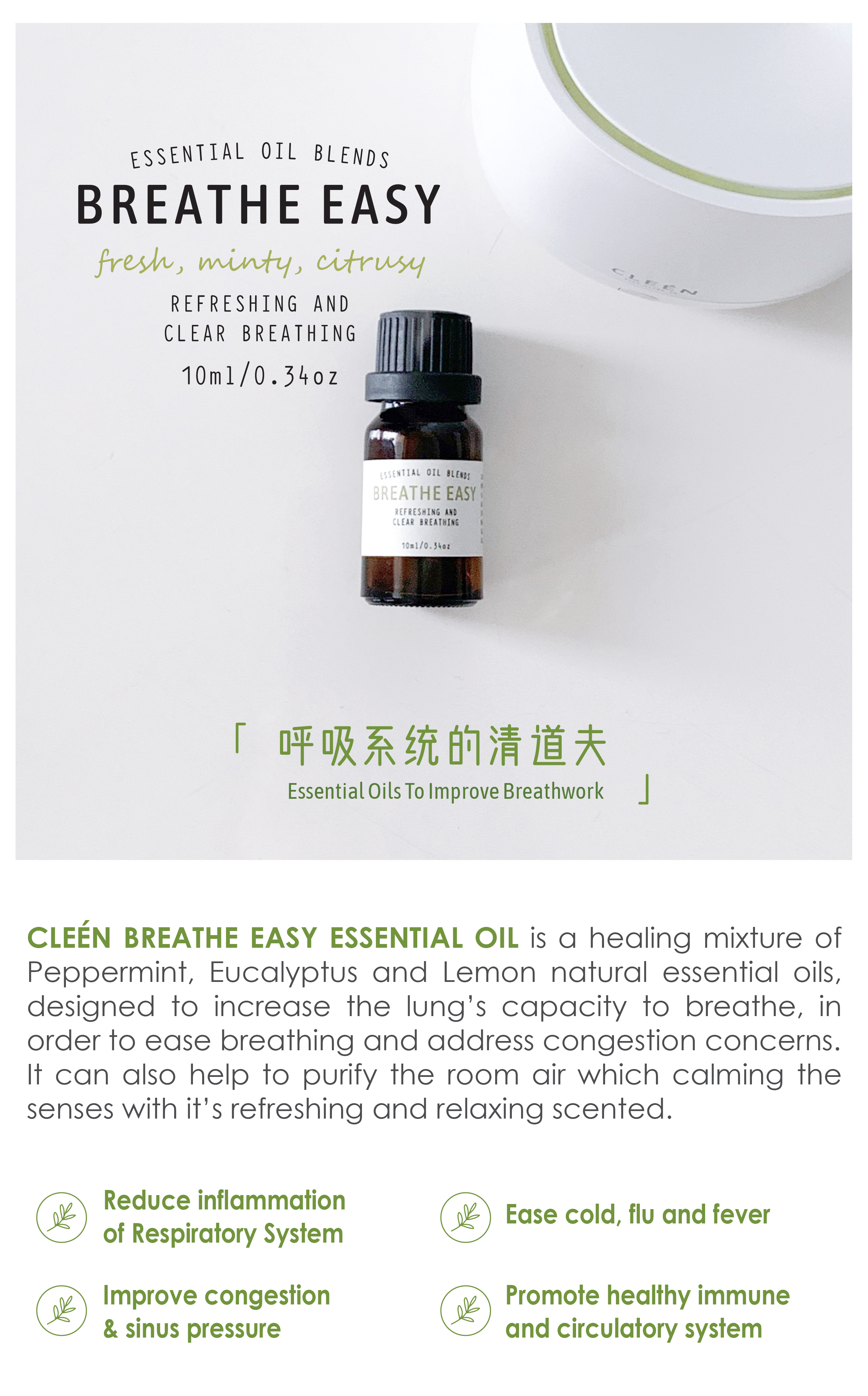 CLEÉN BREATHE EASY ESSENTIAL OIL is a healing mixture of Peppermint, Eucalyptus and Lemon natural essential oils, designed to increase the lung’s capacity to breathe, in order to ease breathing and address congestion concerns. It can also help to purify the room air which calming the senses with it’s refreshing and relaxing scented.